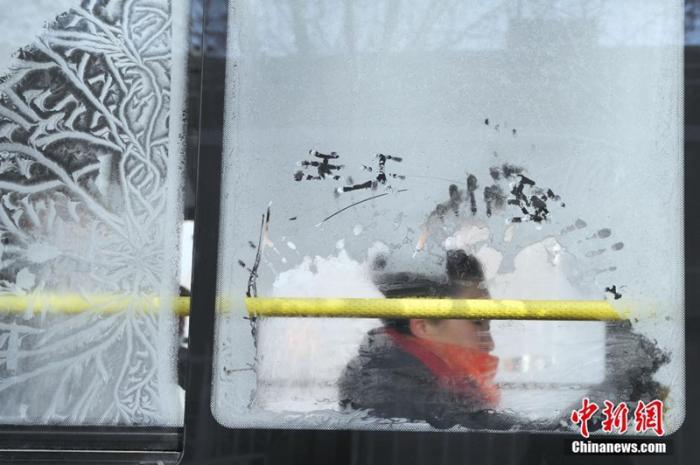 资料图:一位女乘客坐在凝结出冰花的车窗旁,当日是大寒节气。中新社记者 孙昊声 摄