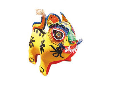 山西吉祥虎枕(也可作为玩具),为意象化的猛虎造型。其造型元素与民间虎头鞋、虎头帽样式如出一辙。虎呈站立姿态,鼻子造型中融入了艾草叶造型。民间观念中,老虎是百兽之王,人们常用艾草制成老虎的形状来驱除疾病,而艾草本身也可治百病,相当于百草之王。虎眼、虎牙、虎耳、虎尾皆用拼装化构件组合而成,身躯上亦分布有花型毛旋,形成吉祥喜庆的装饰风格,与年画之虎相比多了一份稚拙与可爱。布虎多是母亲为孩子所做,体现了中国妇女的心灵手巧和聪明才智。一针针、一线线的缝制,都融入了满腔的爱意。