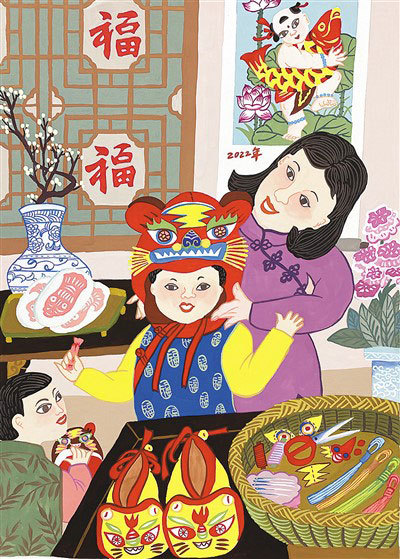 虎的形象在民间美术中十分常见,与人民生活密切相关。民间与虎相关的民俗、生活用品比比皆是。陕西关中嫁女需配送面老虎;孩子小时候要戴虎头帽,穿虎头鞋;土家族则自称为白虎之后,家家户户常年供奉白虎。这些民间美术中的虎,既是对古老文化的传承与发展,也是民间表达吉祥意蕴的象征与寄托。