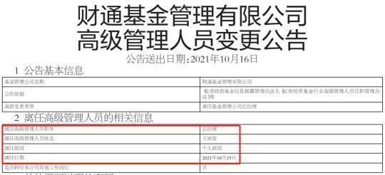 2021年10月,财通基金发布公告称,王家俊因个人原因于2021年10月15日离职,由公司党委委员、副总经理汪海代为履行总经理职务。