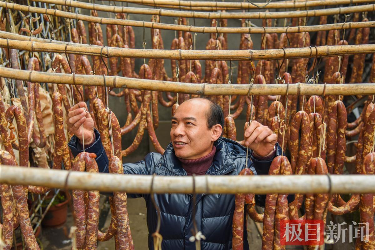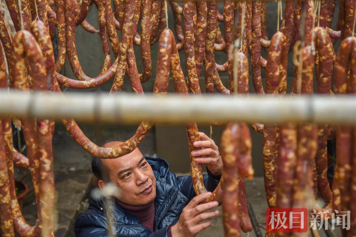 在久旺二楼的一处半掩的阳台,李婧的丈夫王海军则忙着晾晒香肠、腊肉。严选土猪肉,通过纯手工制作的香肠,在冬日干燥的冷风和斜阳的共同作用下,飘香着阵阵腊味。
