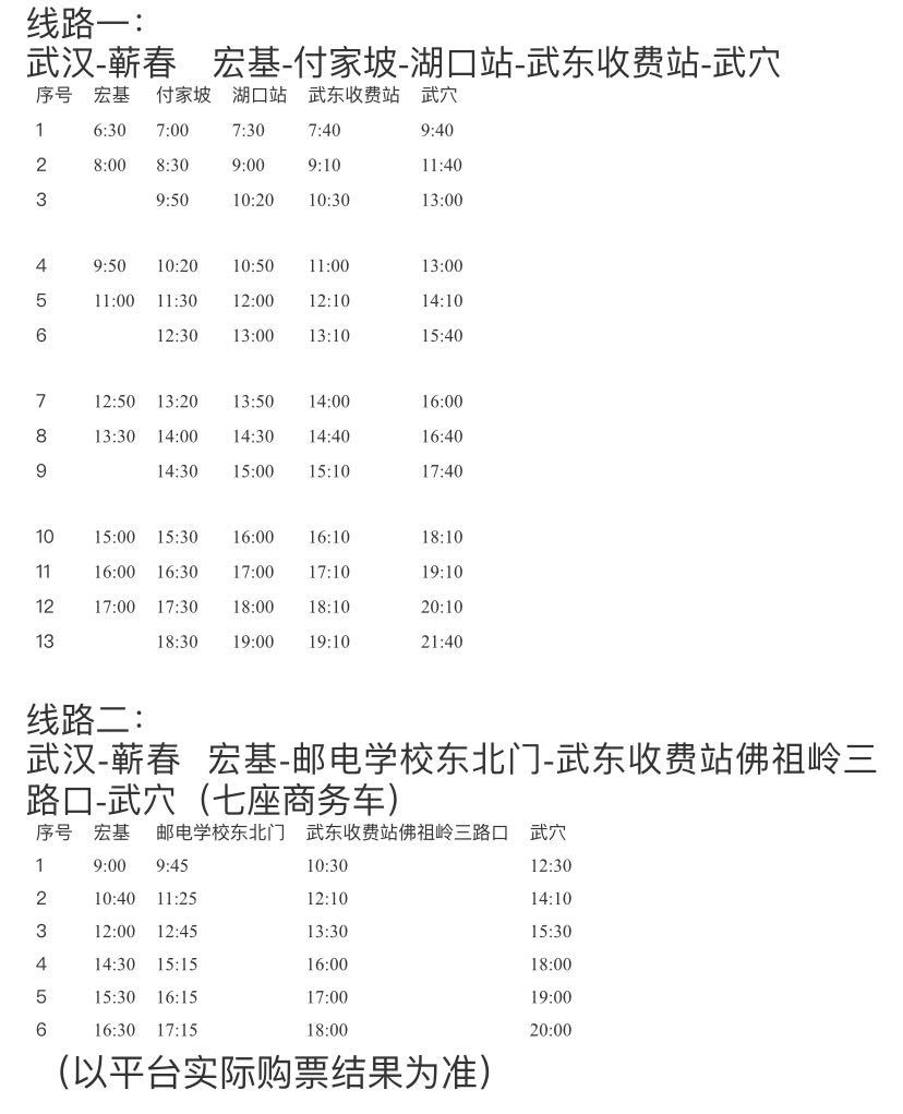 长江日报大武汉客户端1月21日讯(记者王谦 通讯员李媛媛)满足群众春运出行需求,记者获悉,从1月21日起,省客集团新增武汉到武穴班次,武穴定制客运部分班次首次投放7座商务车进行运营,旅客可以在微信公众号“客运96513”或小程序“汉马出行”查询具体班次信息/提前购票。