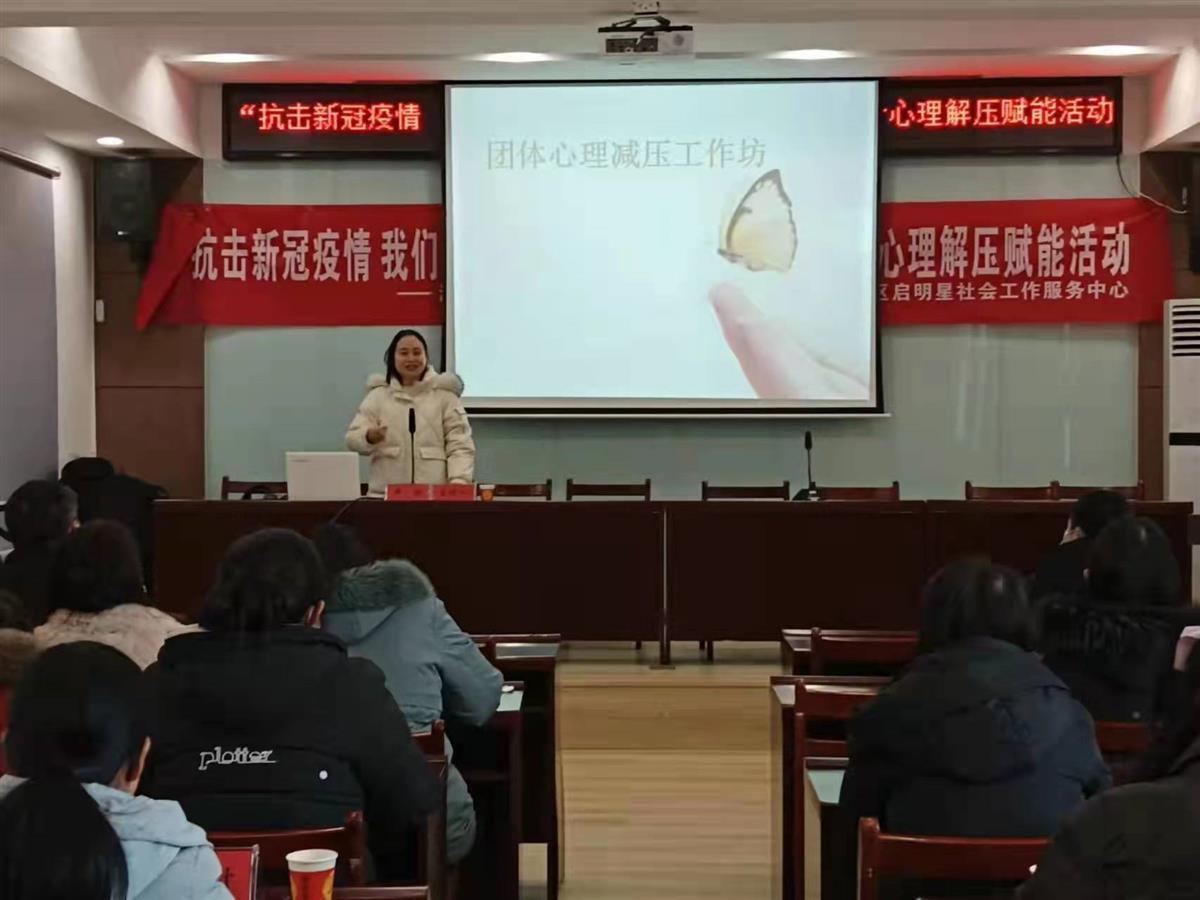 湖北日报讯(记者李光正、通讯员毛红杰、汪耿)1月20日,在武汉市新洲区民政局指导下,新洲区启明星社工潘塘街“五社联动”项目组联合潘塘民政办、潘塘街疫情防控社区组,开展社区一线工作者心理解压活动。