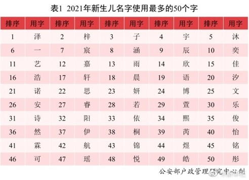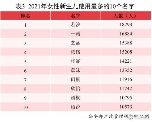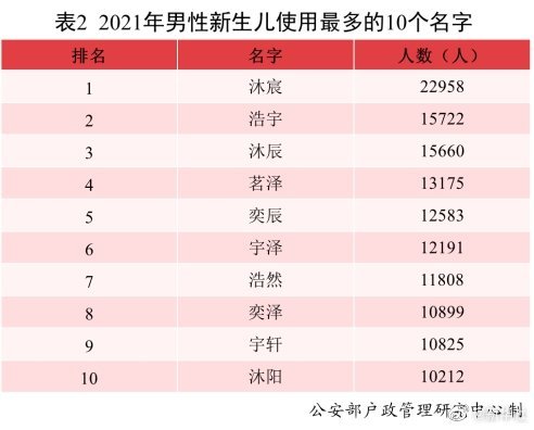 2021年出生并已经进行户籍登记的男性新生儿中,使用频率最高的10个名字依次为:沐宸、浩宇、沐辰、茗泽、奕辰、宇泽、浩然、奕泽、宇轩、沐阳。其中“沐宸”使用人数达到2.3万,登顶榜首,成为男性新生儿名字首选。2021年出生并已经进行户籍登记的女性新生儿中,使用频率最高的10个名字依次为:若汐、一诺、艺涵、依诺、梓涵、苡沫、雨桐、欣怡、语桐、语汐。其中“若汐”使用人数达到1.8万,登顶榜首,成为女性新生儿名字首选。(记者熊丰)