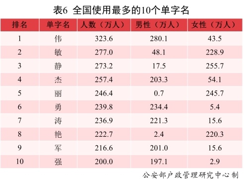 全国户籍人口中,使用频率最高的10个单字名依次为:伟、敏、静、杰、丽、勇、涛、艳、军、强。其中“伟”名列榜首,使用人数为323.6万。男性使用较多的单字名为伟、杰、勇、涛、军、强;女性使用较多的单字名为敏、静、丽、艳。(详见表6)