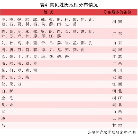 从整体分布看,常见姓氏分布广泛,在全国31个省(区、市)均有分布,但同时也存在一定的空间聚集性。王、李、张等二十二个姓氏人口分布最多的省份是河南;陈、黄、吴等二十个姓氏人口分布最多的省份是广东;刘、孙、高等十二个姓氏人口分布最多的省份是山东;周、唐、彭等十一个姓氏人口分布最多的省份是湖南;徐、朱、丁等九个姓氏人口分布最多的省份是江苏;潘、陆、韦等五个姓氏人口分布最多的省份是广西;杨、何、罗等五个姓氏人口分布最多的省份是四川;程、汪、方等四个姓氏人口分布最多的省份是安徽;邹、熊、万三个姓氏人口分布最多的省份是江西;白、郝两个姓氏人口分布最多的省份是河北;金、毛两个姓氏人口分布最多的省份是浙江;胡、余两个姓氏人口分布最多的省份是湖北;武姓、段姓、马姓人口分布最多的省份分别是山西、云南和甘肃。(详见表4)