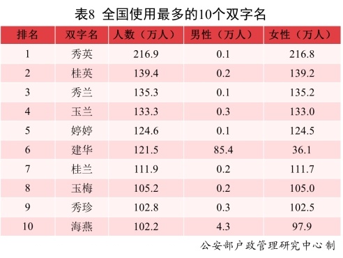 全国户籍人口中,使用频率最高的10个双字名依次为:秀英、桂英、秀兰、玉兰、婷婷、建华、桂兰、玉梅、秀珍、海燕。其中“秀英”名列榜首,使用人数为216.9万。男性使用较多的双字名仅有“建华”;其余常见双字名为女性使用较多,重名率明显高于男性。(详见表8)