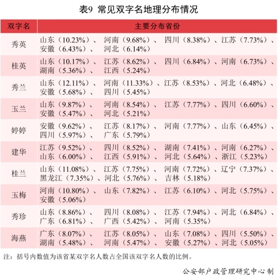全国使用最多的10个双字名相对集中分布在山东、河南、四川、江苏、河北、湖南、安徽等省份。此外,还有5.24%的“桂英”分布在江西;5.79%的“婷婷”、6.81%的“秀珍”、8.07%的“海燕”分布在广东;5.91%、5.23%的“建华”分布在江西和浙江;7.37%、7.35%、5.18%的“桂兰”分布在辽宁、黑龙江和吉林;5.42%的“秀珍”分布在广西。(详见表9)
