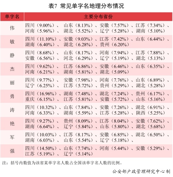 全国使用最多的10个单字名相对集中分布在四川、山东、安徽、河南、江苏、湖北、湖南、辽宁等省份。此外,还有6.20%的“敏”、5.29%的“丽”、6.17%的“勇”、8.09%的“艳”分布在贵州;6.29%的“静”分布在河北;6.15%的“勇”分布在重庆;5.25%的“涛”分布在陕西。(详见表7)
