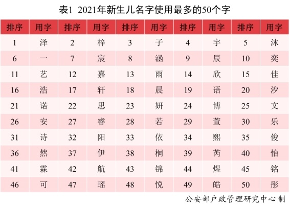 2021年出生并已经进行户籍登记的新生儿名字中,使用频率最高的50个字依次为泽、梓、子、宇、沐等。与2020年相比,汐、芮、霖、航等字受到青睐。(详见表1)