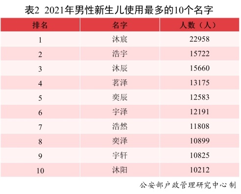 2021年出生并已经进行户籍登记的男性新生儿中,使用频率最高的10个名字依次为:沐宸、浩宇、沐辰、茗泽、奕辰、宇泽、浩然、奕泽、宇轩、沐阳。与2020年相比,除浩宇、奕辰、宇轩外,其余名字首次进入前十,其中“沐宸”使用人数达到2.3万,登顶榜首,成为男性新生儿名字首选。(详见表2)