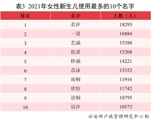 2021年出生并已经进行户籍登记的女性新生儿中,使用频率最高的10个名字依次为:若汐、一诺、艺涵、依诺、梓涵、苡沫、雨桐、欣怡、语桐、语汐。与2020年相比,若汐、艺涵、苡沫首次进入前十,其中“若汐”使用人数达到1.8万,登顶榜首,成为女性新生儿名字首选。(详见表3)