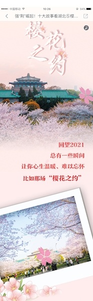 第二种,用H5的形式呈现。为了保证故事的完整性和可读性,产品中融入了大量现场画面。在《樱花之约》中,编辑充分发挥选题特色,设计上大量融入云蒸霞蔚的樱花、医护人员盈盈的笑脸等画面,瞬间把读者代入其中。在《筑牢合作“铁三角”》《湖北“碳”索》等产品中,编辑广泛搜集选题相关数据,将数据内容结合图表、动效等方式动态化呈现,带给读者更加直观的认知。该系列H5产品配上或轻快、或激昂的音乐,读者身临其境,品读故事,更能沉浸式体验和回味“强‘荆’崛起”的奋进时刻,增强了传播效果。