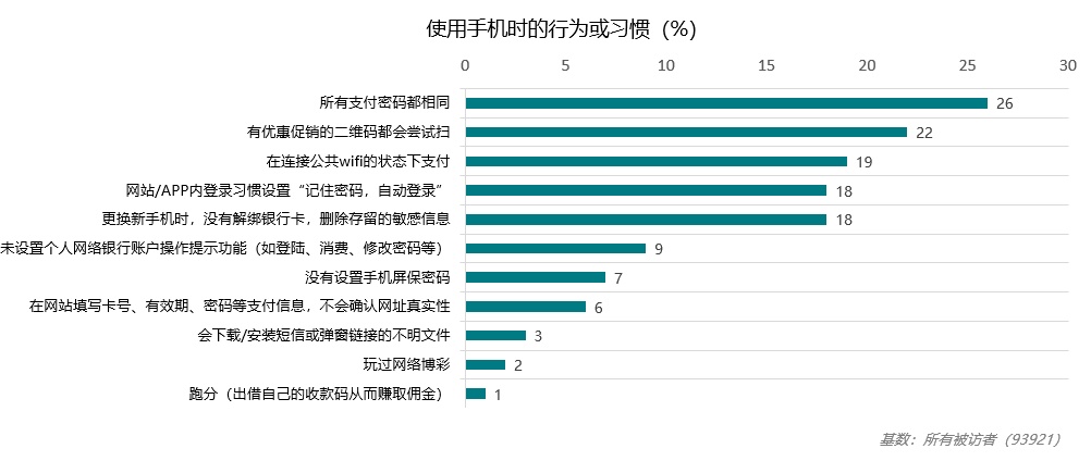 选项:所有支付密码都相同;有优惠促销的二维码都会尝试扫;在连接公共wifi的状态下支付;网站/APP内登录习惯设置“记住密码,自动登录”;更换新手机时,没有解绑银行卡,删除存留的敏感信息;未设置个人网络银行账户操作提示功能(如登陆、消费、修改密码等);没有设置手机屏保密码;在网站填写卡号、有效期、密码等支付信息,不会确认网址真实性。