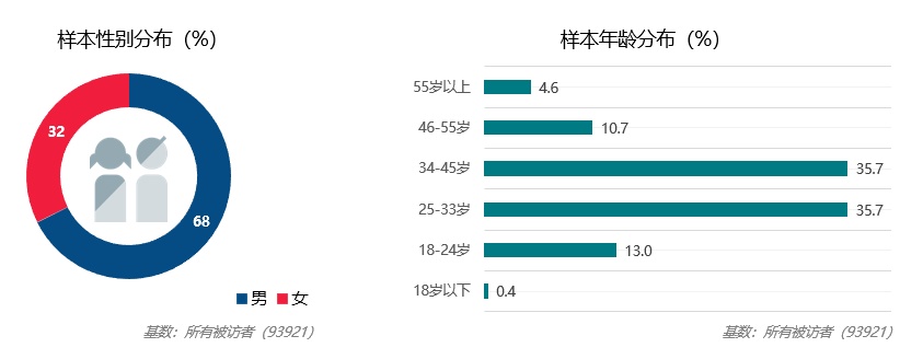 本次调查活动采用线上问卷调研形式,超过19万人次参与答题,共回收来自全国34个省级行政区(含港澳台)有效问卷9.3万余份。其中,男性样本约占68%,25-45岁样本约占70%,来自一线、新一线、二线城市样本达到65%。