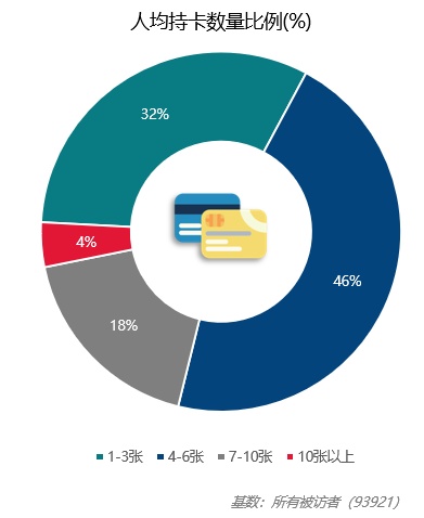 在调研人均持有银行借记卡数量时发现,平均每人有5.23张借记卡, 其中中高层管理者持卡数较多,人均超过6张,大学生人群持卡数相对较少,为人均3.4张。