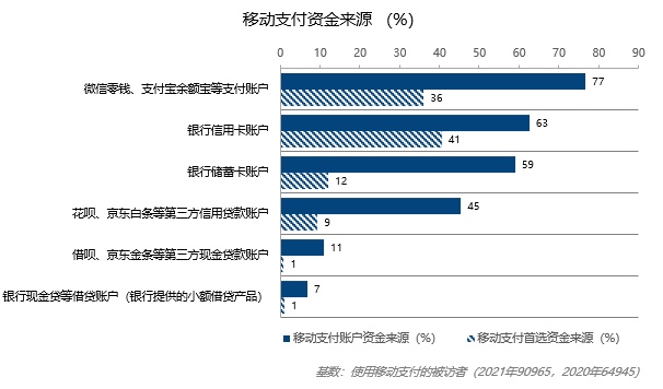 调查显示,77%的用户选择从支付工具余额等可以灵活存取的支付账户付款。其次分别是信用卡账户(63%),储蓄卡账户(59%),花呗、白条等第三方信用贷款账户(45%)。