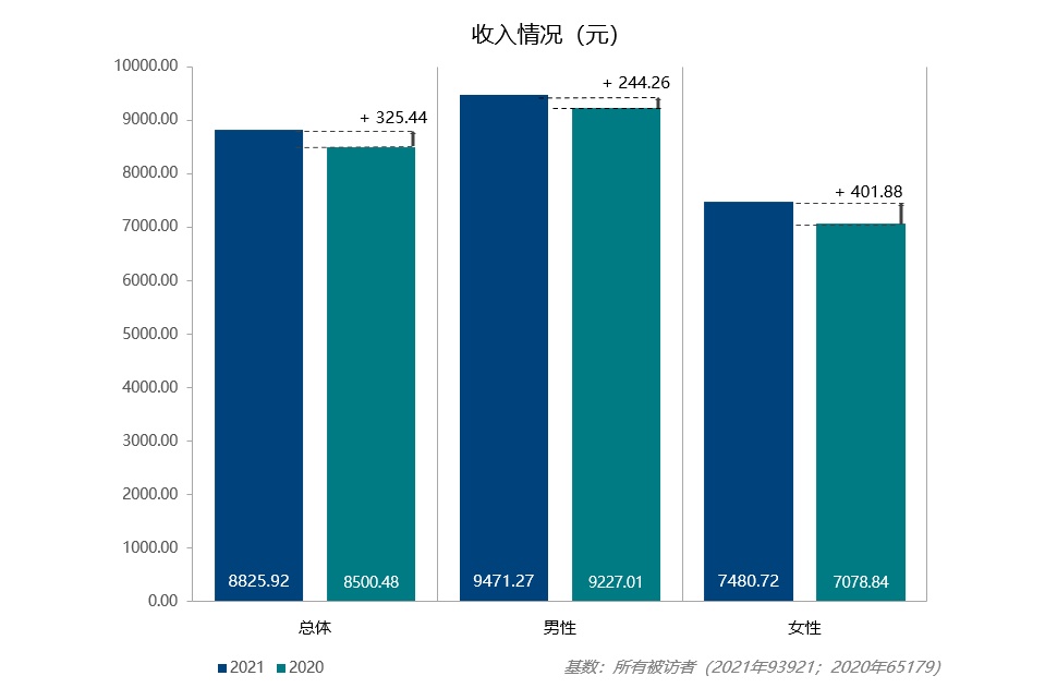 从性别看,受访女性平均收入增幅较男性更大,接近7500元,较2020年增加约400元;受访男性平均收入约为9500元,较2020年下降了200余元,而月均收入在5000元以上的受访女性占比约为55%,同比增加了4%。