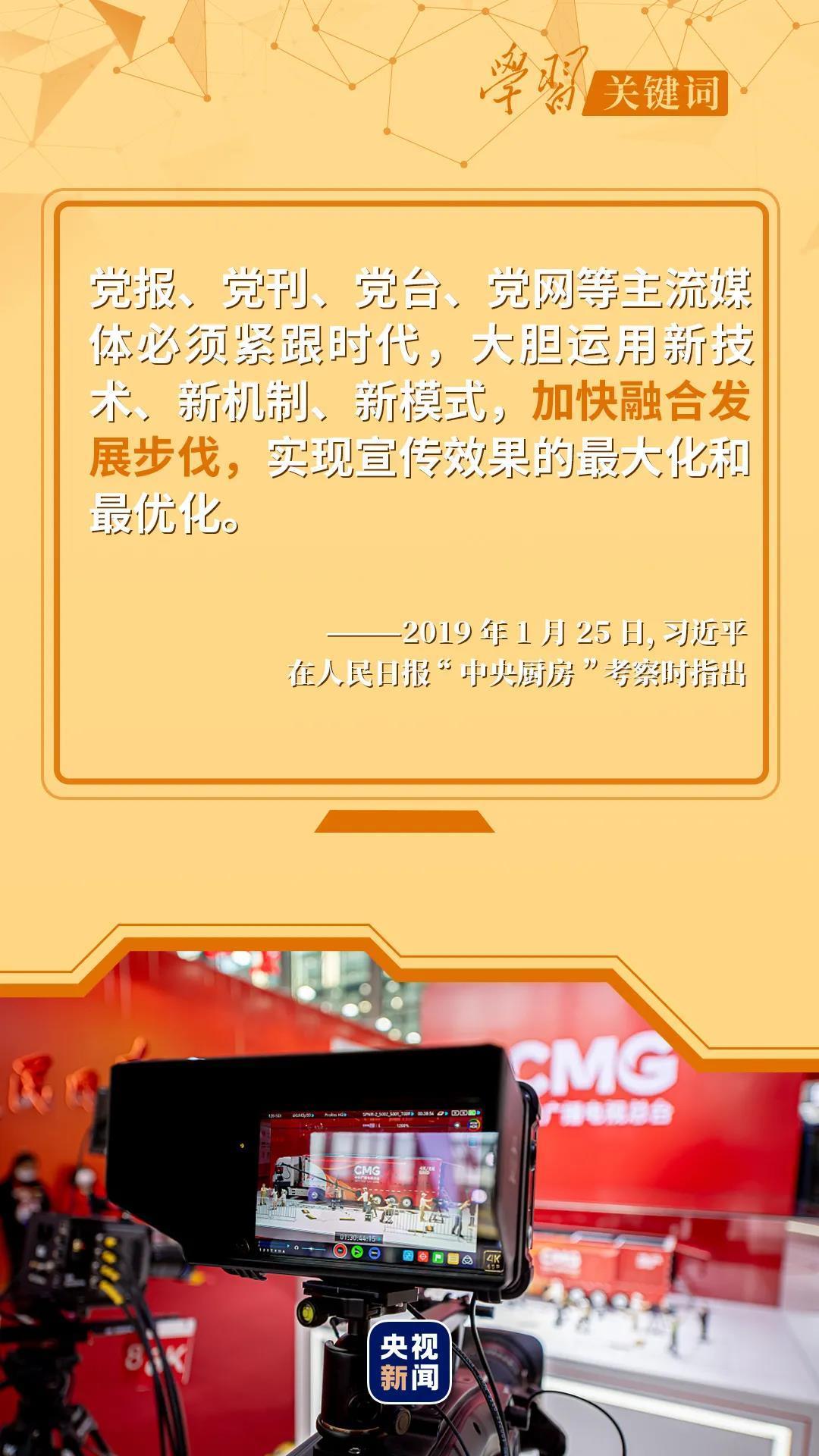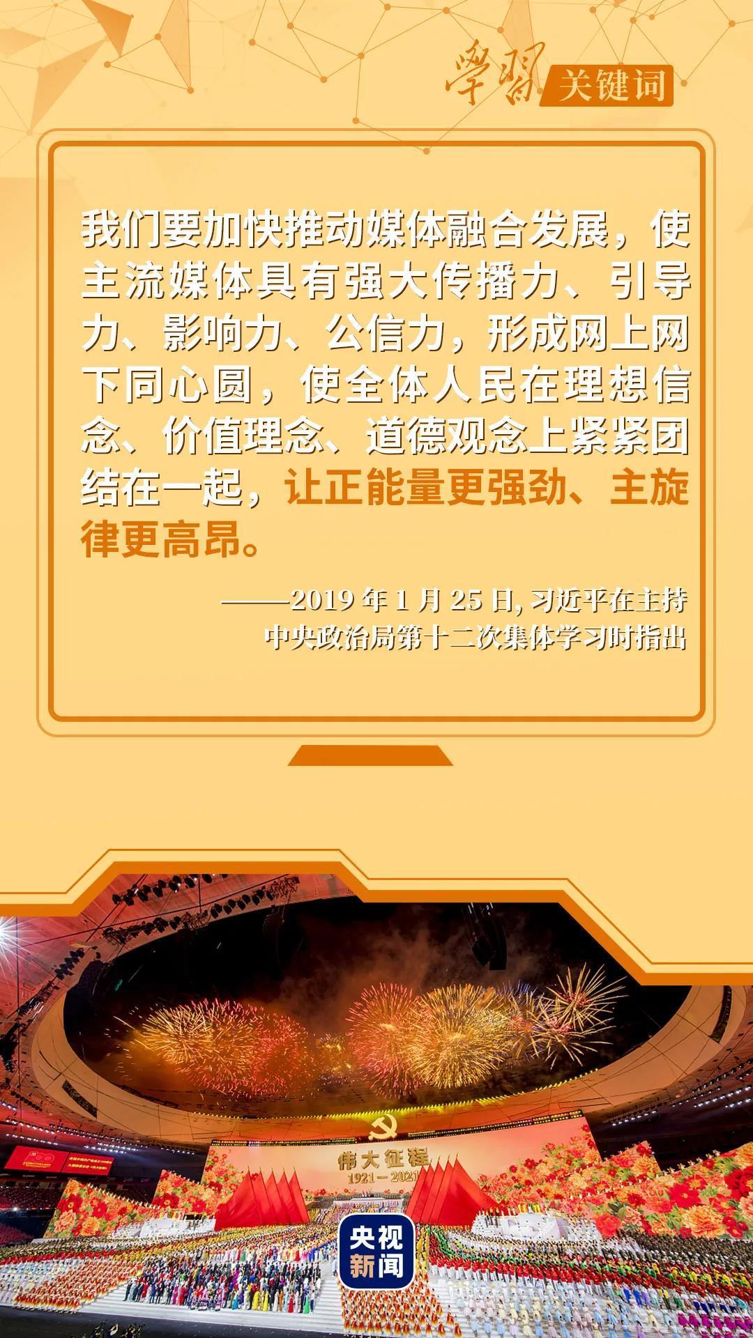 “我们推动媒体融合发展,是要做大做强主流舆论,巩固全党全国人民团结奋斗的共同思想基础,为实现‘两个一百年’奋斗目标、实现中华民族伟大复兴的中国梦提供强大精神力量和舆论支持。”