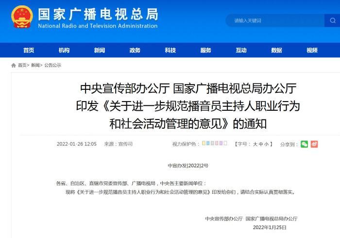 中新网1月26日电 据国家广电总局网站消息,近日,中央宣传部办公厅、国家广播电视总局办公厅联合发布《关于进一步规范播音员主持人职业行为和社会活动管理的意见》。其中提到,各级宣传部门、广播电视行政部门、播出机构要教育引导播音员主持人,自觉抵制名利诱惑和低俗庸俗媚俗,净化“交际圈”“朋友圈”。