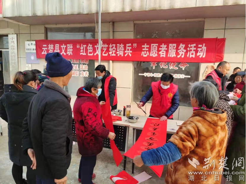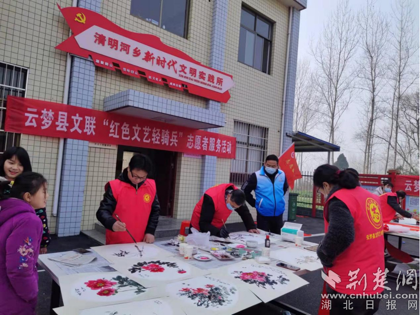 荆楚网(湖北日报网)讯(通讯员李新峰、郑红梅)1月25日,云梦县清明河乡虹光社区广场、农家书屋人头攒动,一大群赶集的群众正围聚在一个个“红马甲”周围,观赏云梦县文联“红色文艺轻骑兵”志愿者绘画、写春联,还有部分村民在农家书屋内翻阅图书,阅读刚更新的图书。室内看书,室外送春联,较好地营造了浓厚的清明河乡人民喜迎春节的文化氛围。