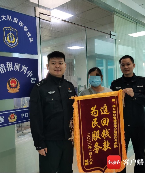 新海南客户端、南海网、南国都市报1月27日消息(记者 李波)近日,海口龙华警方帮助两名电信诈骗受害群众成功追回被诈骗资金115万元。为此,两名受害当事人先后来到海口龙华公安分局犯罪侦查大队反诈专业队,将两面写有“人民警察为人民 失而复得暖人心”与“追回钱款 为民服务”内容的锦旗交给办案民警,以此表达真诚的感谢之情。
