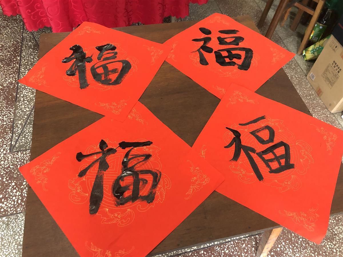 三兄弟的妻子在厨房张罗团年饭,孙长清招呼儿子喜迎、艺华和孙女一起,给刘国宝写“福”字,送到他的新屋里贴起来。