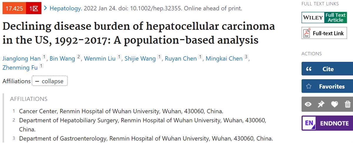 论文题为“Declining disease burden of hepatocellular carcinoma in the US, 1992-2017: A population-based analysis”(肝细胞肝癌的疾病负担在美国呈现下降趋势,1992-2017:基于人群的分析)。在本项研究中,武汉大学人民医院为论文唯一署名单位。肿瘤中心副主任付振明教授及消化内科陈明锴教授为论文通讯作者,肝胆外科汪斌教授及第一临床学院硕士研究生韩江龙为文章第一作者。