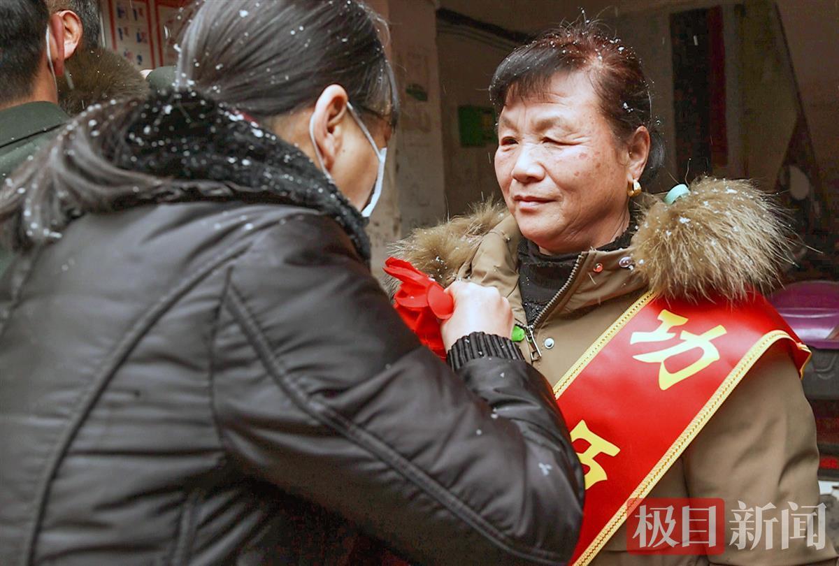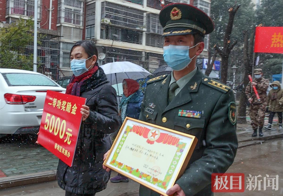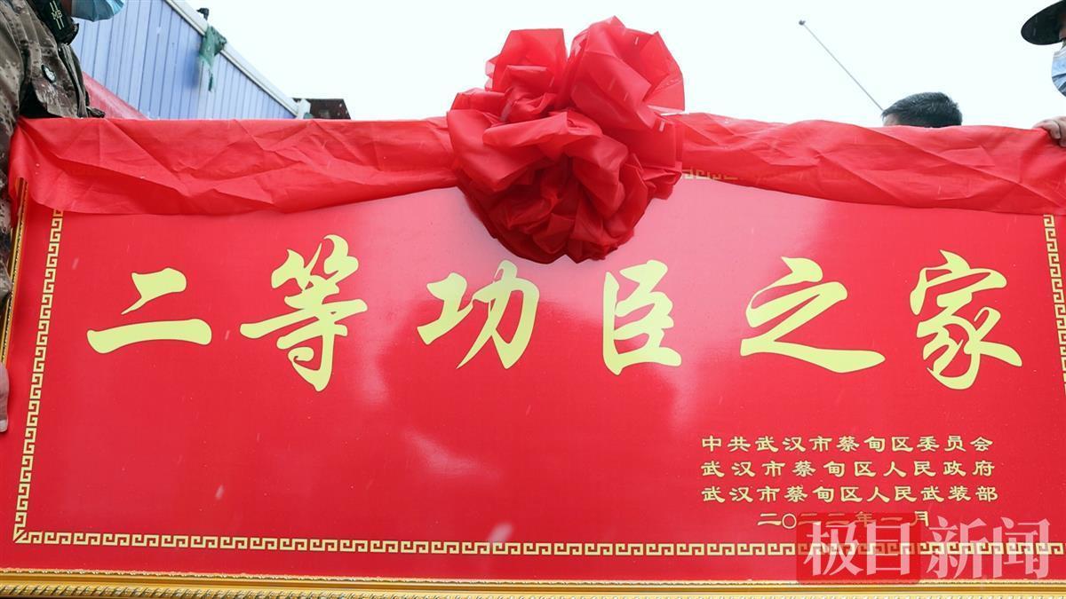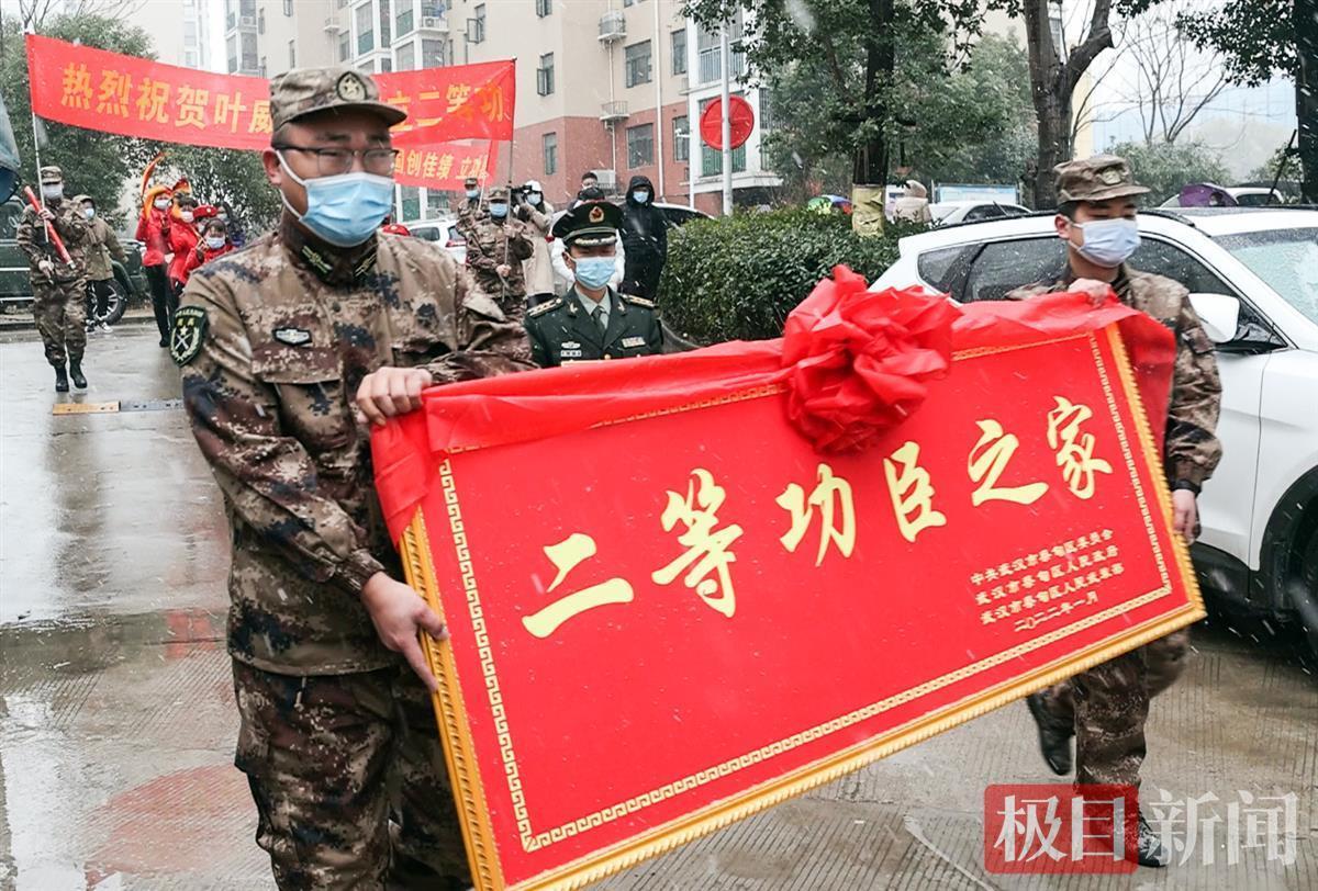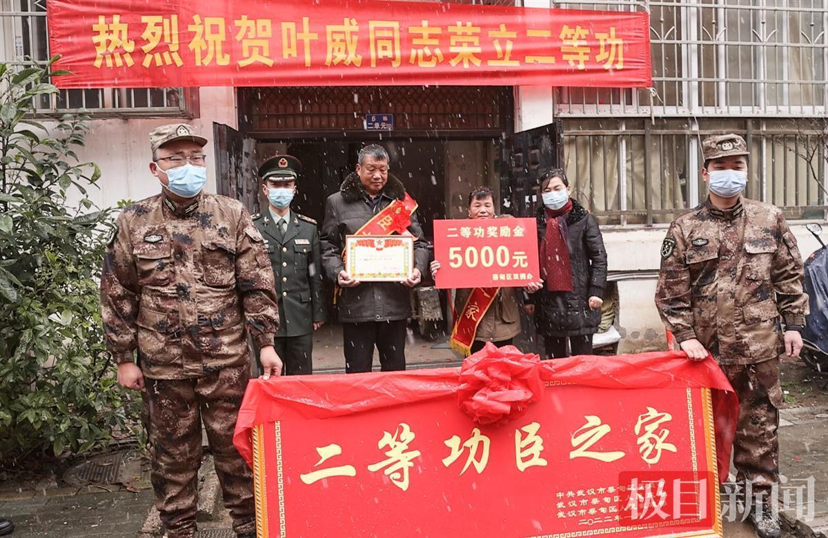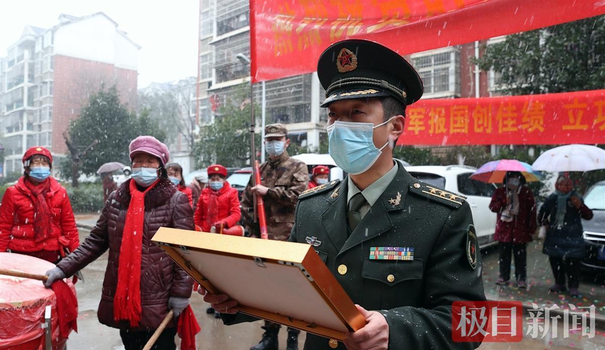 报喜的锣鼓声中,武汉市蔡甸区人民部、区退役军人事务局,冒着寒冷的雨雪天为荣立二等功的空军某部现役军官叶威家庭送上立功喜报、慰问金和颁发“二等功臣之家”的牌匾。