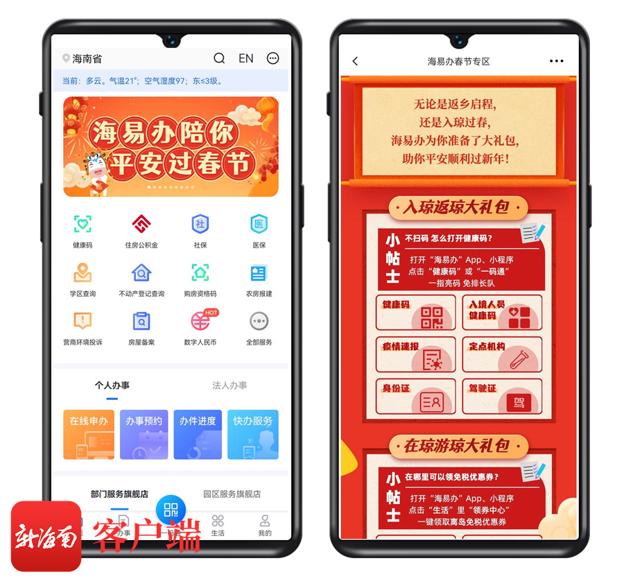新海南客户端、南海网、南国都市报1月30日消息(记者 姚皓 通讯员 汪楚楚)“‘海南健康码’‘疫情速报’‘电子证件’……‘海易办’有春节专区!太方便了吧!”近日,在深圳工作的冯女士准备回海南过年了,她要提前进行海南健康码打卡。打开“海易办”后发现,这里已经贴心打包好回家所需的各种假期相关服务了。“真贴心,还是‘大礼包’的形式,仪式感满满!回家之路幸福感满满!”冯女士说道。