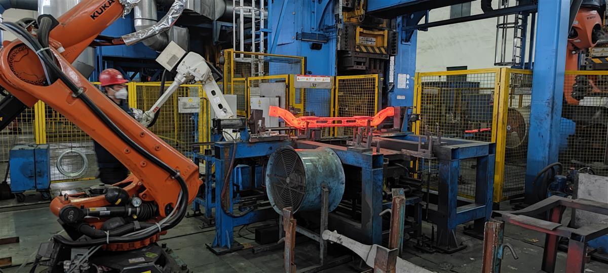 一台机械臂将烧红的汽车前轴放上架子,另一台机械臂绕着架子转了一圈,随后汽车前轴被拿走,进行下一道工序。“绕着架子走的那台机器,发出我们看不到的蓝光,对高热状态下的汽车前轴进行了检测,这就是我们和华中科技大学合作的锻件热态检测技术。”锻造一车间主任鲁勇介绍,前轴锻件加热后,超过850度,过去只能等锻件冷却之后再检测,如果锻件有问题,只能直接作废。锻件热态检测技术投入使用后,锻件还在高温状态下,就查出问题,可及时修正,不仅降低成本,还大幅提高良品率。目前该公司的良品率已经超过99%。这项锻件热态检测技术获2020年中国机械工业科技进步一等奖。