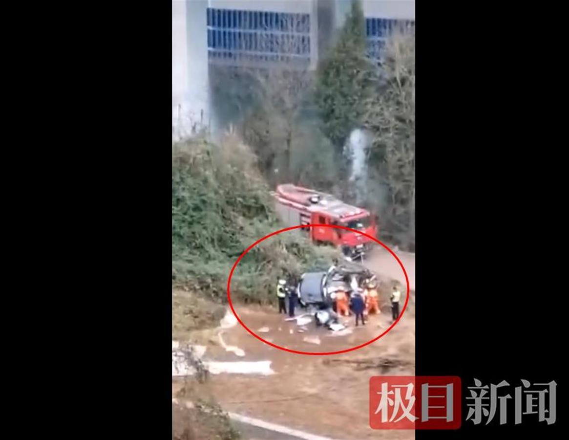 极目新闻记者在多段现场视频中看到,一辆黑色越野车掉落在陡坡下,车身严重变形,救援人员正在破拆车体。
