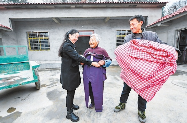 驻村干部和村干部一起送来新买的棉被和衣服,“被子看着就暖和,衣服比着就合身!”钟立英老人笑得合不拢嘴。