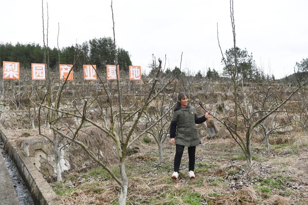 1月27日,桥头镇田畈村脱贫户杨小梅在查看梨树生长情况。新华社记者王全超摄