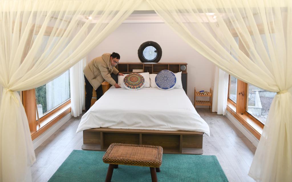 1月27日,桥头镇桥头村一民宿工作人员在整理房间。新华社记者王全超摄