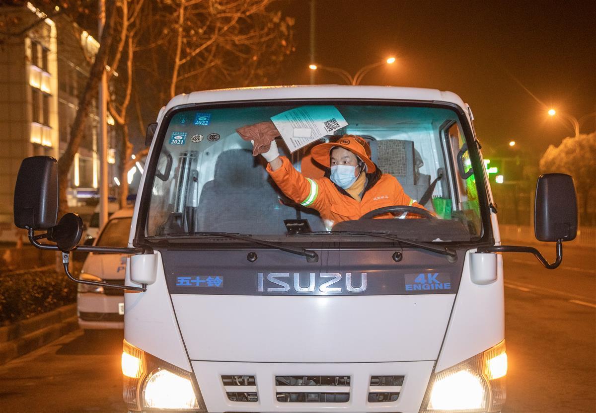 环卫工人罗明霞已经上岗。换好工作服、戴上口罩、驾驶垃圾压缩车,像往常一样开始一天的清运工作,即使今天是1月31日,除夕。