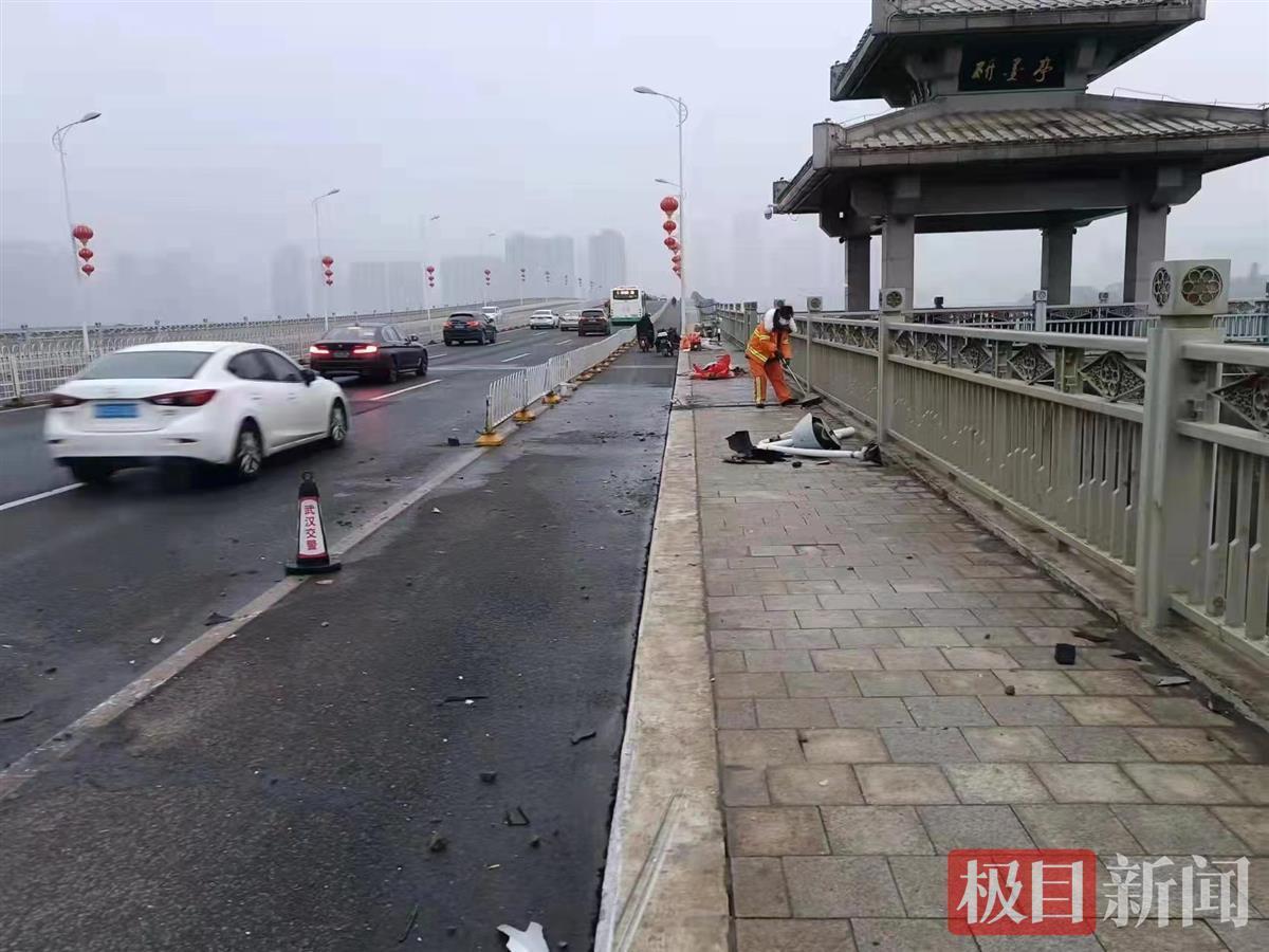 当日上午6时,汉阳区城管执法局环卫集团三公司值班领导宋承璋巡查时,发现墨水湖大桥事发现场一片狼藉,事故车辆已被拖离现场,机动车道与非机动车道之间的隔离护栏被撞散架,桥上护栏被撞出十几米长的缺口,两处大桥路灯柱倒地,严重影响市容市貌及交通出行。