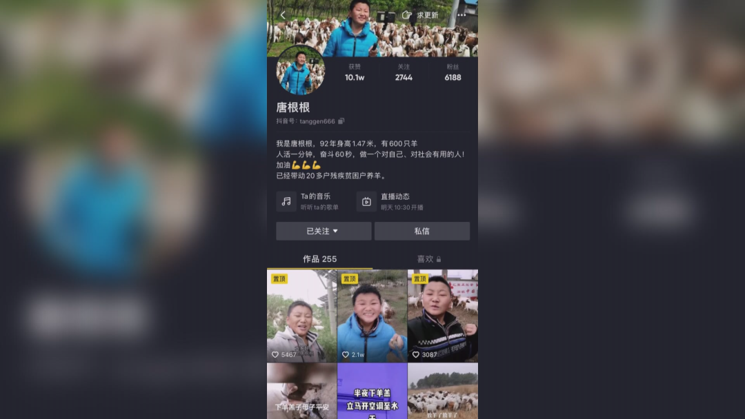 勤奋好学的唐根根并不满足于此,为了带动更多人致富,他开通了自己的抖音直播号。每天坚持拍一条,或拍羊群食草,或拍母羊生小羊,唐根根坚持自己出镜,给网友们讲解技术要点和心得体会。唐根根自强不息的精神,吸引了来自全国各地“粉丝”,有的点赞加油,有的交流技术,还有的直接下单采购成品羊。