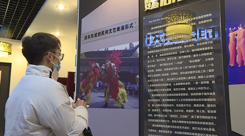 在非物质文化遗产展览馆,现就读于西安电子科技大学的大四学生韩冰对杨河高跷、魏河舞狮等非物质文化遗产产生了浓厚兴趣。寒假的学习参观,让他进一步了解了家乡丰富的历史文化,激发了他热爱家乡、建设家乡的情怀。