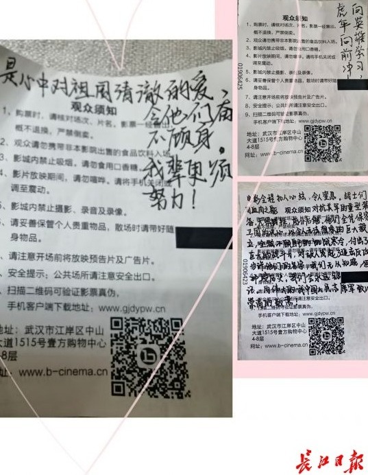 看完电影后,女生文思涵的心情久久不能平静,她想到了自己身为医者的父亲,联想到近两年来在疫情防控一线持续战疫的各行各业的“城市英雄”。思涵在票根空白处默默写下一段话:“是心中对祖国清澈的爱,令他们奋不顾身。我辈更须努力!”