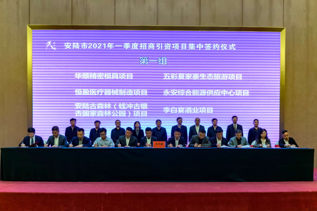 2021年4月17日,安陆市举行2021年第一季度招商引资项目集中签约仪式。永安LNG综合能源、荣光岁月文旅、五彩夏家寨生态旅游、华顺精密模具等26个项目集中签约,总投资额145.2亿元,吹响了“开局就是决战、起跑就要冲刺”的号角。