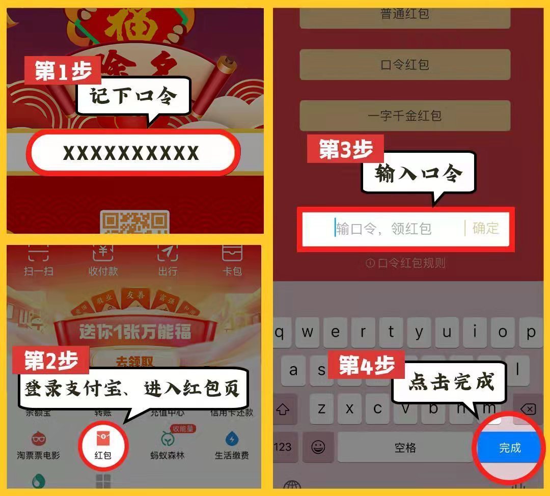 第二步,记住所发图片中显示的红包口令,请登录支付宝—点击或搜索“红包”—输入口令,点击“完成”就可以抢红包了。