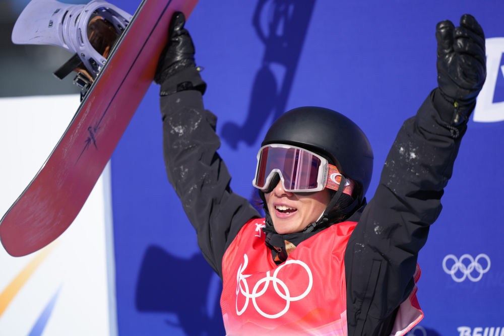 2月6日,中国选手苏翊鸣赛后庆祝。当日,在北京2022年冬奥会单板滑雪项目男子坡面障碍技巧资格赛中,苏翊鸣以资格赛第一的成绩晋级决赛。新华社记者薛玉斌摄