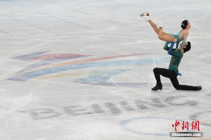 2月7日,北京2022年冬奥会花样滑冰团体赛冰上舞蹈自由舞比赛在首都体育馆举行。中国冰舞组合王诗玥/柳鑫宇身着“青山绿水”比赛服惊艳众人。男伴的衣衫绘有“青峰叠嶂”,女伴的一袭水蓝色裙宛如“浮云绿水”。中新社记者 崔楠 摄