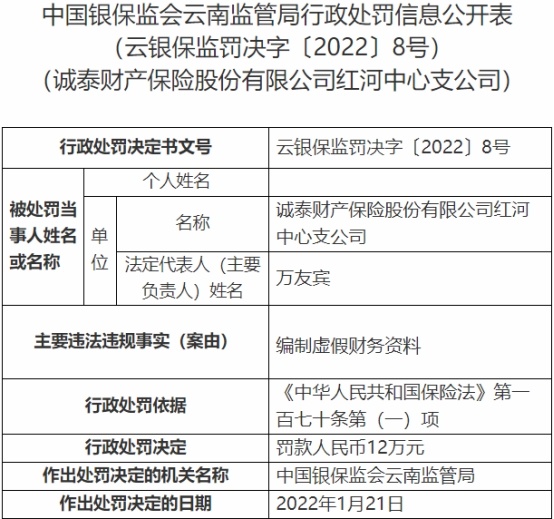 中国经济网北京2月7日讯 银保监会网站近日公布云南监管局行政处罚信息公开表(云银保监罚决字〔2022〕8号、9号),诚泰财产保险股份有限公司红河中心支公司(以下简称“诚泰财险红河中支”)存在编制虚假财务资料违法违规事实,银保监会云南监管局依据《中华人民共和国保险法》第一百七十条第(一)项对其罚款人民币12万元。