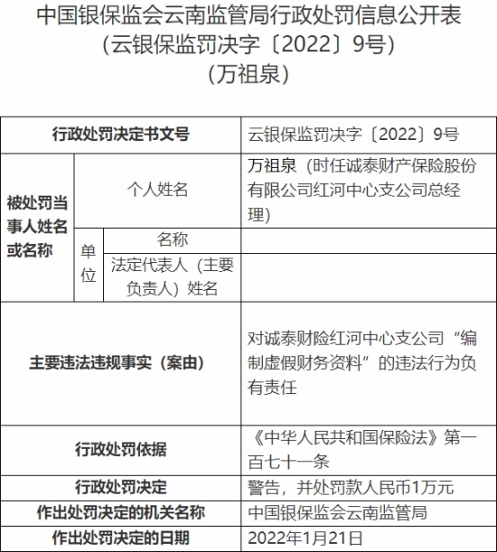 万祖泉时任诚泰财险红河中总经理,对诚泰财险红河中支上述违法行为负有责任,银保监会云南监管局依据《中华人民共和国保险法》第一百七十一条对其警告,并处罚款人民币1万元。