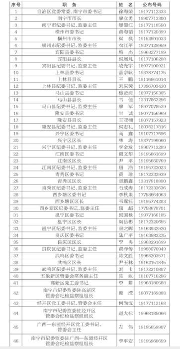 中新网记者在这份通知中看到,广西壮族自治区党委常委、南宁市委书记徐海荣,南宁市市长廖立勇,南宁市纪委书记、南宁市监察委员会主任缪佃江以及南宁市下辖横州市、宾阳县、上林县、马山县、隆安县、兴宁区、江南区、青秀区、西乡塘区、邕宁区、良庆区、武鸣区、五象新区、高新技术产业开发区、经济技术开发区、广西—东盟经济技术开发区的党政主要官员和纪委书记(纪检监察组组长)的电话号码均向社会公布。