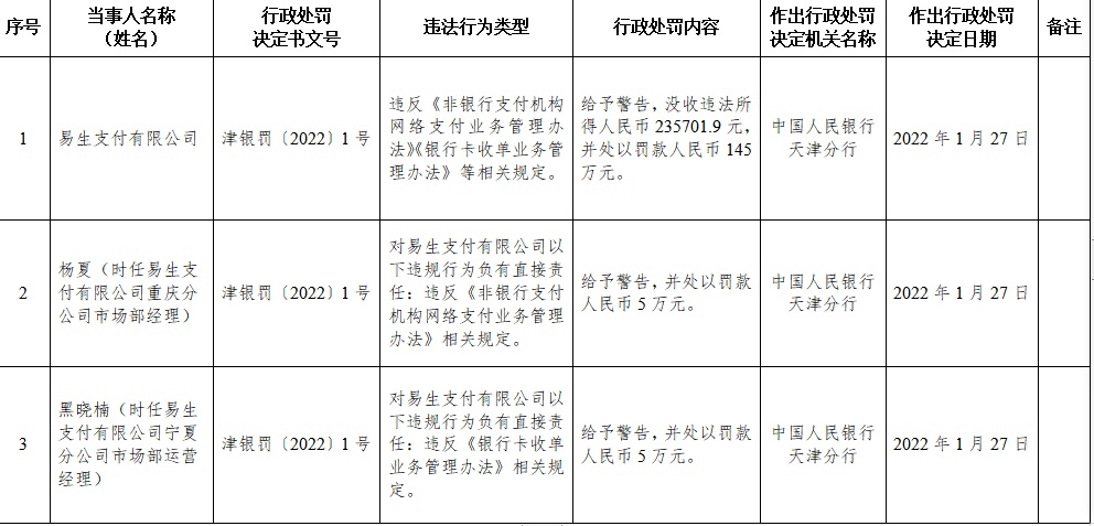 中国经济网北京2月7日讯 中国人民银行天津分行网站日前发布的行政处罚公示表(津银罚〔2022〕1号)显示,易生支付有限公司违反《非银行支付机构网络支付业务管理办法》《银行卡收单业务管理办法》等相关规定。中国人民银行天津分行2022年1月27日决定,对其给予警告,没收违法所得人民币23.57万元,并处以罚款人民币145万元,共计罚没168.57万元。