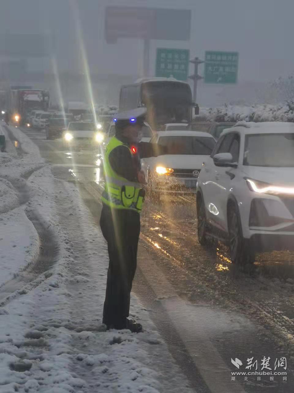 7日晚,虽然大雪已经停止,但是低温仍在持续,23时,湖北高速交警发布道路结冰预警,京港澳、沪蓉、沪渝等25条高速公路结冰风险较高。为保障道路畅通,高速交警全面强化重点路段示警值守,对大型桥梁、桥隧相连、出隧即桥、弯坡路段,部署警力加强实时监测,“线上线下”巡控结合,每小时收集辖区路面结冰及处置情况,确保“第一时间发现、第一时间处置”。在福银高速公路孝感段,云梦大队宁文海巡逻300余公里,逐一排查辖区6座桥梁,清理标志牌积雪,确保警示效果明显。