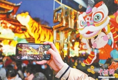 游客用手机拍摄生肖虎灯。 殷立勤 摄